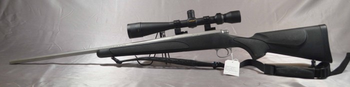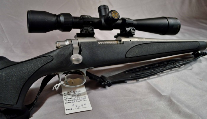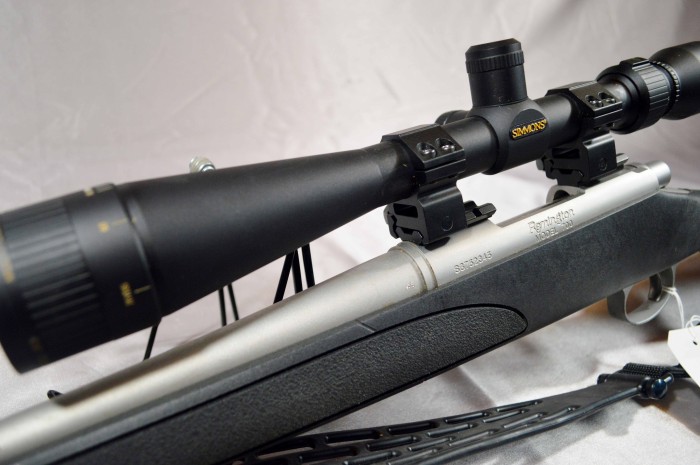 This is a clean pre-owned rifle showing minor signs of use or wear. The scope is a Simmons 6-24x42 with a duplex reticle. The optics are clear and crisp. The stainless barrel is clean and shiny with crisp rifling