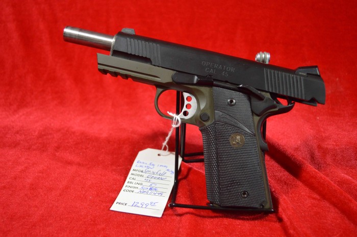 This is a very clean pre-owned pistol in very good condition. This "Bundle" consists of ; Springfield branded 1911 range bag, 2 stock mags (8 + 1) and a Wilson Combat extended mag (12+1) and a cleaning tool. Chambered for .45ACP. The finish is flat parkerized black / od green