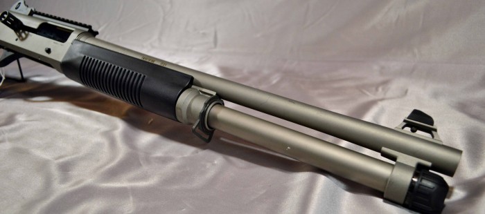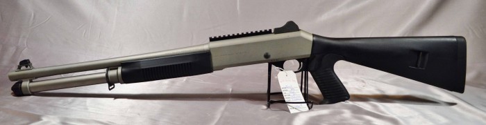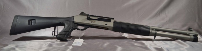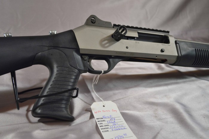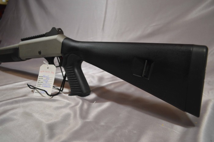 This is a pre-owned stainless Benelli M4 semi auto 12 ga shotgun in LiKE NEW condition. I don't think that this one has ever been fired. The barrel is 18" Chambered for 2 3/4" and 3" shells. Comes with a range bag