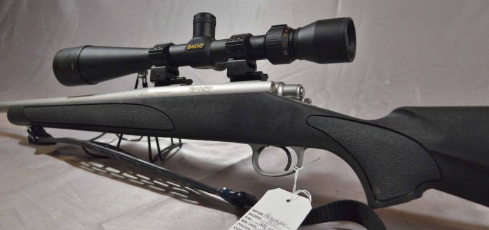 This is a clean pre-owned rifle showing minor signs of use or wear. The scope is a Simmons 6-24x42 with a duplex reticle. The optics are clear and crisp. The stainless barrel is clean and shiny with crisp rifling