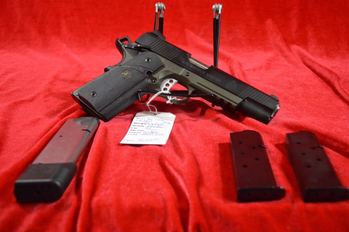 This is a very clean pre-owned pistol in very good condition. This "Bundle" consists of ; Springfield branded 1911 range bag, 2 stock mags (8 + 1) and a Wilson Combat extended mag (12+1) and a cleaning tool. Chambered for .45ACP. The finish is flat parkerized black / od green